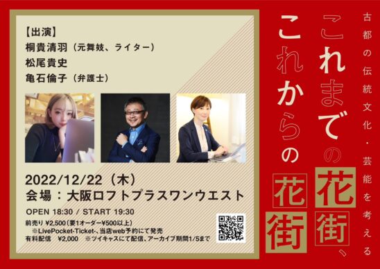 今回大阪ロフトがこのイベントを企画した趣旨は隣町・京都の観光資源ともなっているこの文化の問題を改めて議論するために桐貴清羽さんに登壇して頂き、ご本人が見てきたこれまでの花街・京都の実態をお話しして頂きながら、時代と歩んでいけるこれからの花街をみんなで議論できればと考えています。