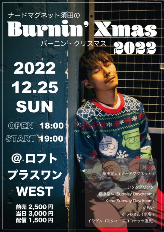 昨年はオンラインで開催され大好評だったクリスマスの須田ソロイベント。今年はついにリアルイベントとしてナードマグネット須田の「バーニン・クリスマス2022」が開催されることになりました!