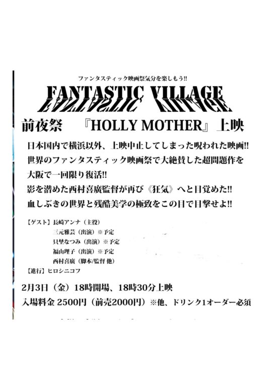 世界各国のファンタスティック映画祭で大絶賛した《呪われた映画》が大阪で一夜限りの復活!! 影を潜めた西村喜廣監督が再び《狂気》へと目覚めた!! 血しぶきの世界と残酷描写の極致を目撃せよ!!