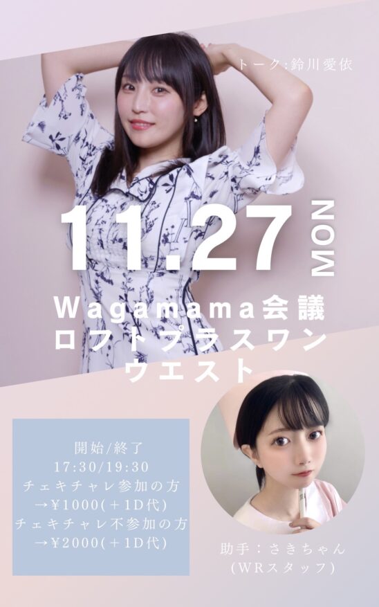 SCHEDULE 2023 11 27 Monday 『Wagamama会議』 OPEN 17:00 - START 17:30 Tweet 【出演】 鈴川愛依 さきちゃん(WRスタッフ) TICKET18:00-これまでの経歴、制作秘話等 18:30-お悩み相談、質問箱回答、今後の展望など 19:00-19:30 終演後物販 ◎観覧について チェキチャレ参加の方→¥1000(+1オーダー) チェキチャレ不参加の方→¥2000(+1オーダー) 前売チケットは当店ウェブ予約にて予約受付中 Share このイベントの予約は締めきりました。