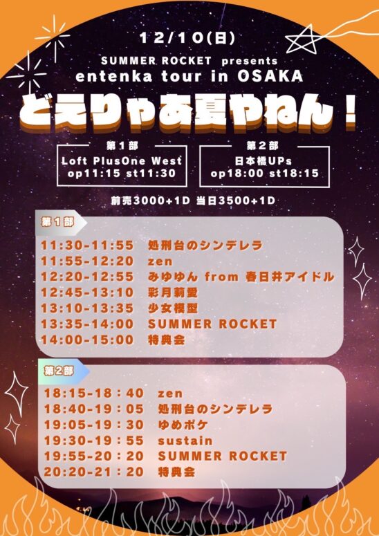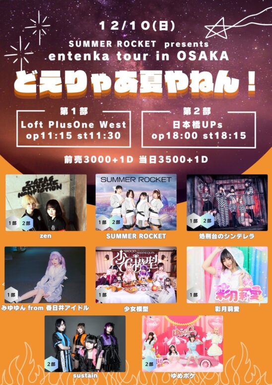 SCHEDULE 2023 12 10 Sunday DAY EVENT SUMMER ROCKET presents entenka tour in Nagoya・Osaka -どえりゃあ夏やねん!-day2- 第1部 OPEN 11:15 - START 11:30 Tweet 【出演】 処刑台のシンデレラ zen 彩月莉愛 みゆゆん from 春日井アイドル 少女模型 SUMMER ROCKET TICKET前売3000+1D 当日3500+1D 予約:https://tiget.net/events/285880 Share