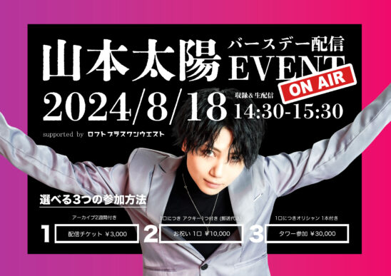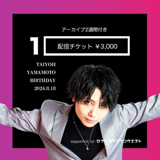 SCHEDULE 2024 08 18 Sunday DAY EVENT 配信のみ! 『山本太陽バースデー配信EVENT』 START 14:30 Tweet 【出演】 山本太陽 TICKET◎配信について 配信チケット:¥3,000 ■配信チケットコチラから ※購入受付期間、アーカイブ:9月1日(日) 23:59まで ※配信サービスの仕様上、放送の遅延などが発生する場合がございます。 アーカイブは遅延なくご覧いただけますので予めご了承ください。 ※配信内容を録画するなどして再配信する行為は禁止させて頂いております。 Share