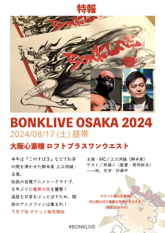 SCHEDULE 2024 08 17 Saturday DAY EVENT ※中止※『BONKLIVE OSAKA 2024』 OPEN 12:30 - START 13:00 Tweet 【ゲスト】 岸誠二(監督・筋肉担当) ——他、交渉中・計画中 【主催・MC】上江洲誠(脚本家) TICKETこちらのイベントは台風7号の影響により中止となりました。 チケットをご購入いただきました方には後日返金対応とさせていただきます。 ご理解の程よろしくお願いいたします。 Share 現在予約を受け付けておりません。