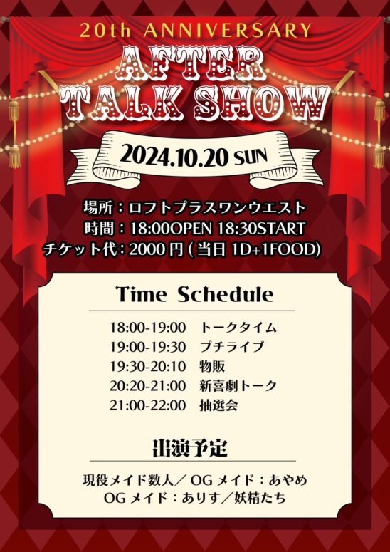 6日に行います20周年ライブには打ち上げがないので、代わりにトークイベントをしちゃいます!大人気な抽選会もこちらのイベントで行います☆