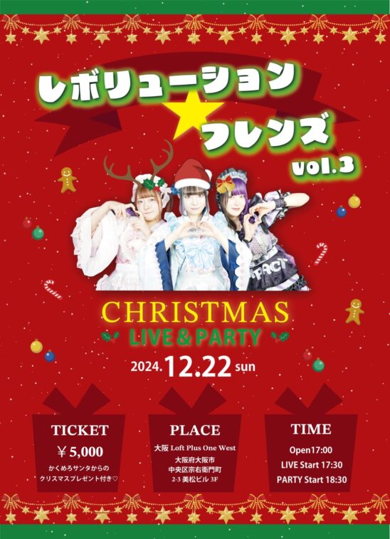 SCHEDULE 2024 12 22 Sunday 革命メロイック presents レボリューション⭐フレンズvol.3 OPEN 17:00 - START 17:30 Tweet 【出演】 革命メロイック TICKET◎観覧&配信について 前売¥5,000/当日¥5,500(共に1オーダー必須) ■観覧チケットe+にて購入可能です。 ※16日10:00~販売開始 Share