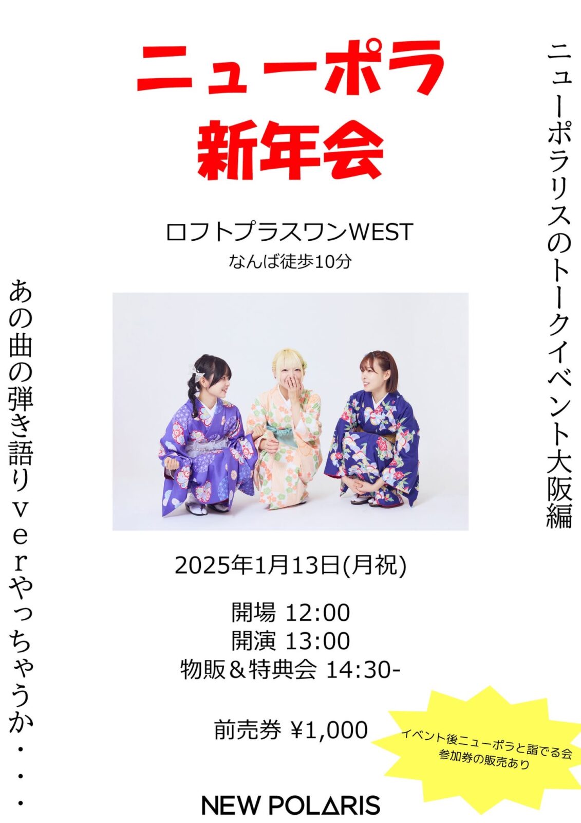 SCHEDULE 2025 01 13 Monday DAY EVENT 「ニューポラ新年会」 OPEN 12:00 - START 13:00 Tweet 【出演】 NEW POLARIS TICKET◎観覧について 前売¥1000当日¥2000(共に1オーダー必須) ■観覧チケットは下記チケット予約から受付中 Share このイベントの予約は締めきりました。