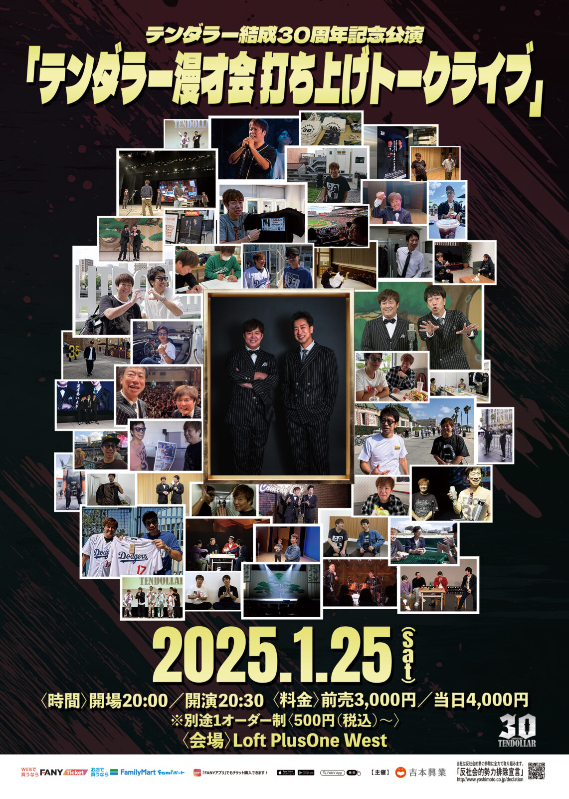 SCHEDULE 2025 01 25 Saturday テンダラー結成30周年記念公演「テンダラー漫才会打ち上げトークライブ」 OPEN 20:00 - START 20:30 Tweet 【出演】 テンダラー TICKET前売¥2,500 / 当日¥3,000(+drink)完売御礼! イベント詳細はこちら Share
