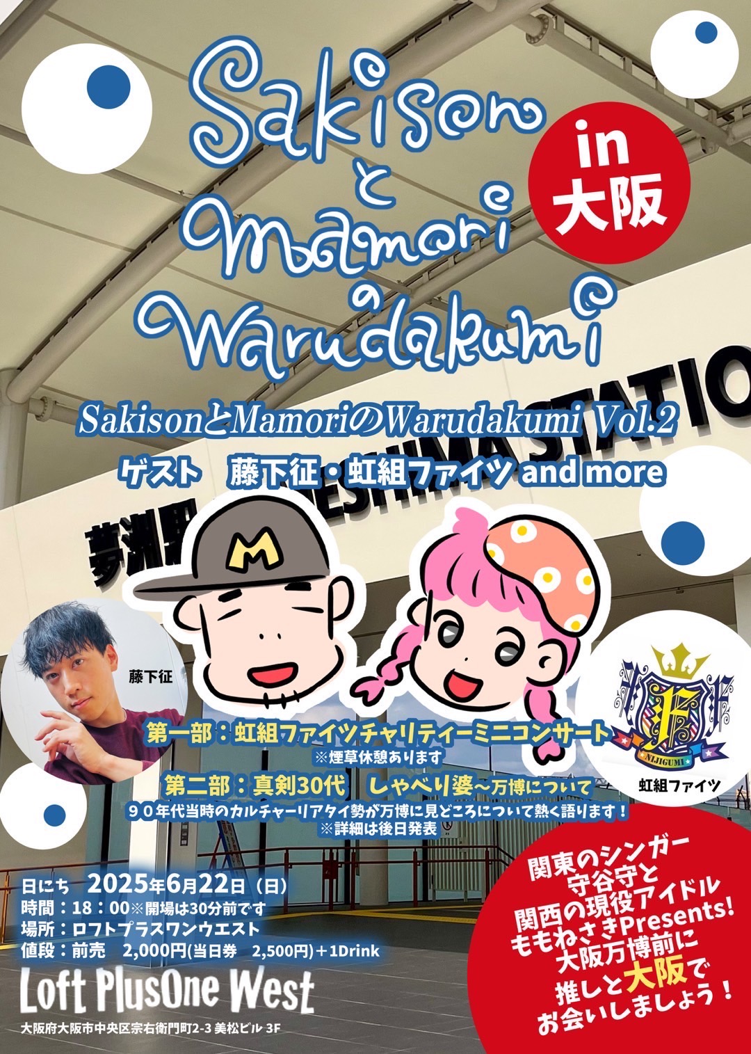 せっかくだからと万博前の日にソウルメイトのももねさきと一緒に(表向きは)世界平和を願うチャリティーイベントを再び開催!大人気ゲイ・アイドル藤下征クン率いる虹組ファイツも参戦し、前回とは一味違う笑いあり涙ありのスペシャルな夜をお届けします!