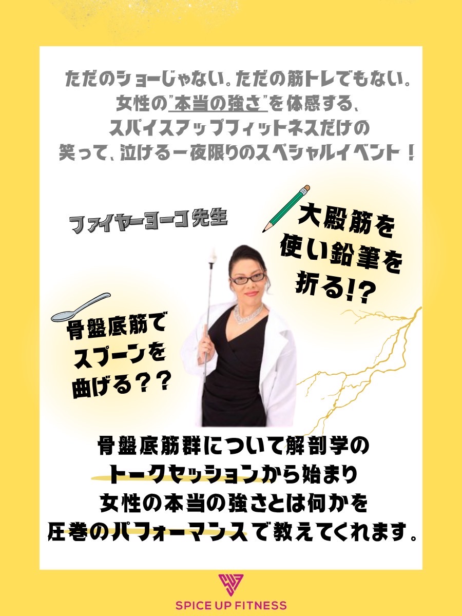 SCHEDULE 2025 09 28 Sunday 「ファイヤーヨーコ最終章 一夜限りのスペシャルイベント〜骨盤底筋と大殿筋が物語る 女の底力は筋肉でできている〜」 OPEN 15:30 - START 16:00 Tweet 【出演】 ファイヤーヨーコ 岡部友 TICKET 料金 前売5,500円(+1オーダー) 当日6,600円(+1オーダー) #ファイヤーヨーコ#岡部友 Share このイベントの予約は締めきりました。