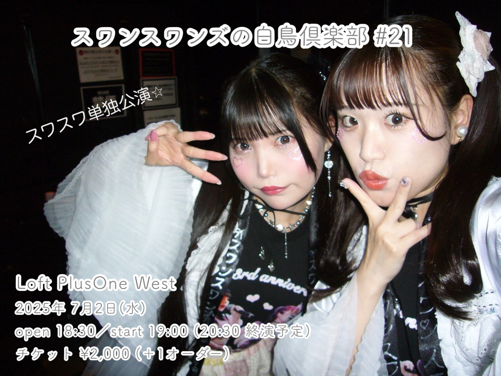 SCHEDULE 2025 07 02 Wednesday スワンスワンズの白鳥倶楽部#21 OPEN 18:30 - START 19:00 Tweet 【出演】 スワンスワンズ TICKET《会場チケット》 前売¥2,000 (+1オーダー) 会場チケットはtigetにて受付中 (6/23(月)22:00-) 《配信チケット》¥1,500 配信チケットはキャスマーケットにて発売中 ※アーカイブはイベント終了後2週間視聴可(繰り返し大丈夫です) #スワンスワンズ Share