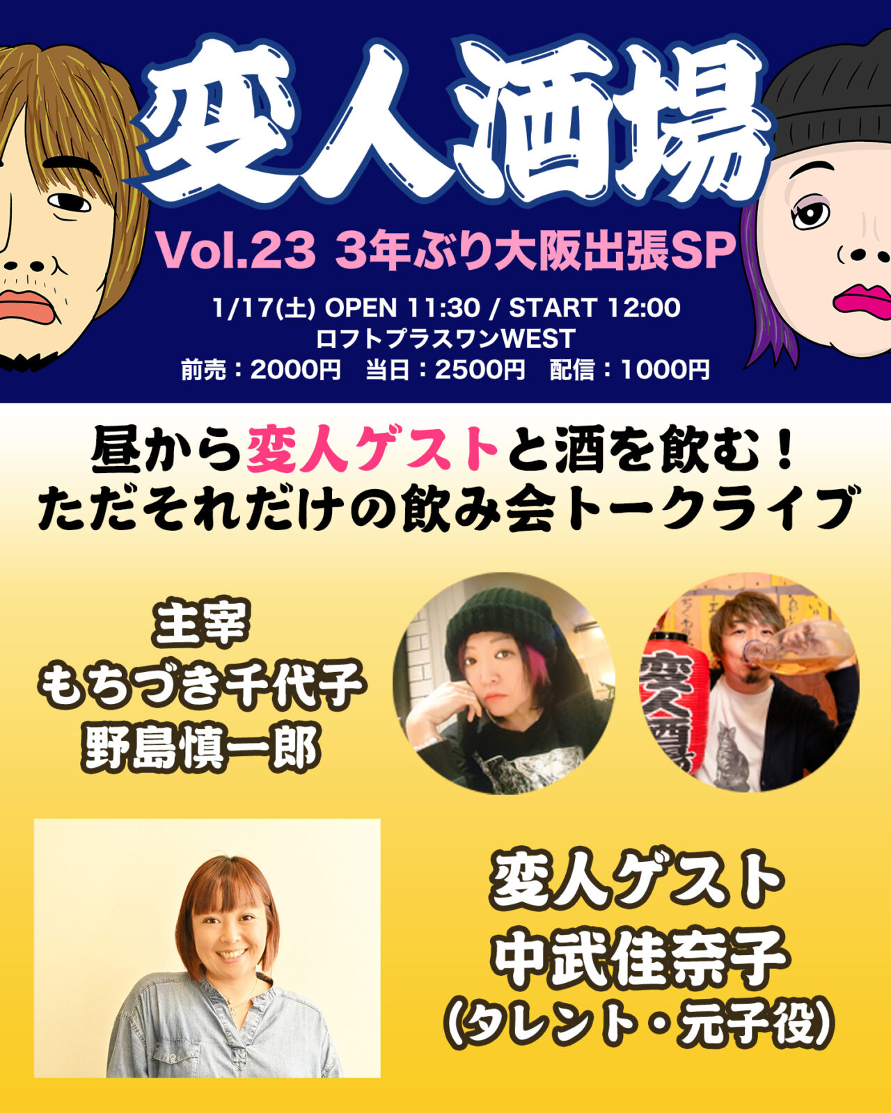 ライターのもちづき千代子と野島慎一郎が変人ゲストを招き、その変人エピソードを肴にステージ上で酒を飲む。
