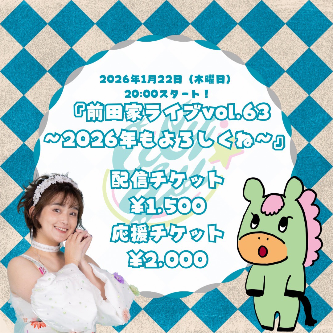 SCHEDULE 2026 01 22 Thursday 配信のみ 『前田家ライブvol.63 2026年もよろしくね〜』 START 20:00 Tweet 【出演】 LILY&YU TICKET《配信チケット》¥1,500 配信チケットはキャスマーケットにて発売中 ※アーカイブはイベント終了後2週間まで視聴可 #LILY&YU Share
