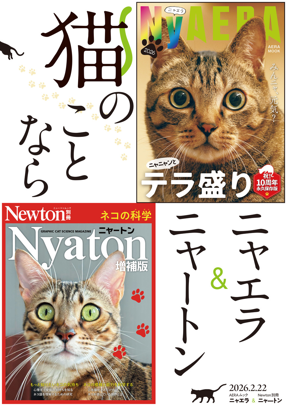 猫だらけの『ニャエラ』(AERA別冊)と猫をとことん科学した『ニャートン』(Newton別冊)が2/14に同時発売。発売記念トークイベントを開催します! ゲストに猫写真家の沖昌之さんをお迎えして ニャエラとニャートンのデスクが別冊の内容や編集の裏話を楽しく紹介します。