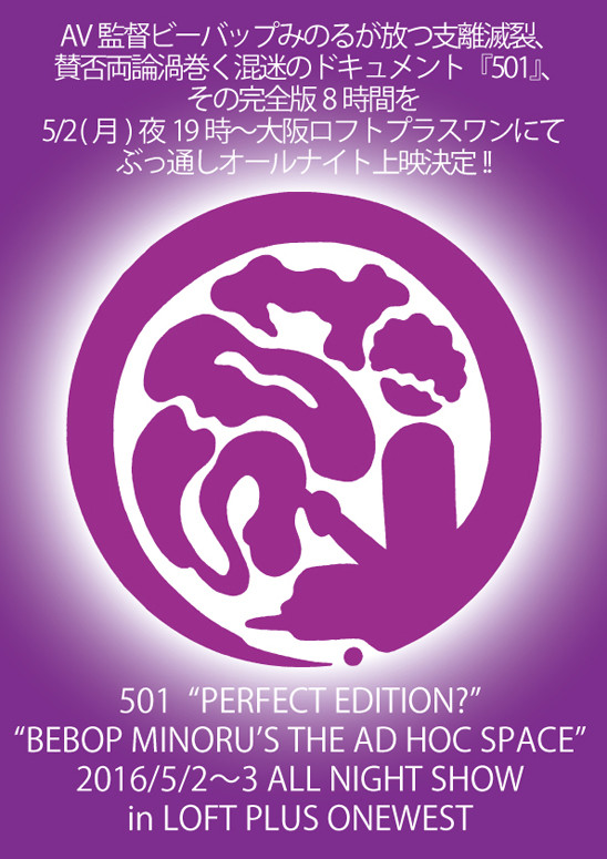 2016年1月、謎のお正月映画としてレイトショー公開されるや、連日超満員を記録し、大阪での上映も成功させるも、そのぶっ飛んだ編集&内容から賛否両論が続出したAV監督ビーバップみのるの極私的カルトムービー『劇場版 501』。