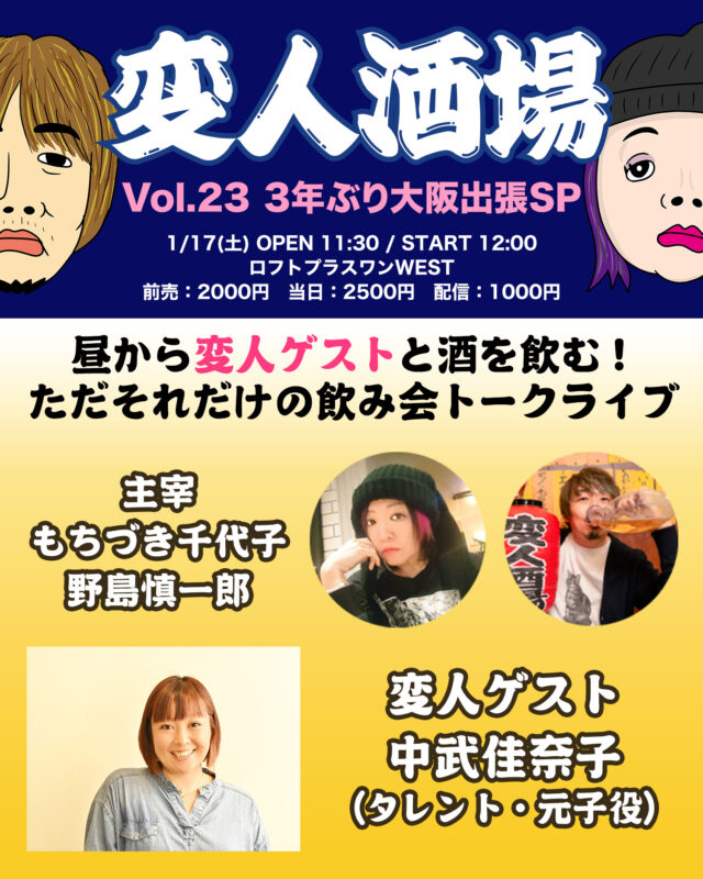【出演】 もちづき千代子(ただのライター) 野島慎一郎(ライター・B級フード研究家) 【変人ゲスト】 中武佳奈子(タレント・元子役) ネイキッドロフト横浜発“飲み会トークライブ”企画が約3年ぶりに大阪開催決定! ライターのもちづき千代子と野島慎一...